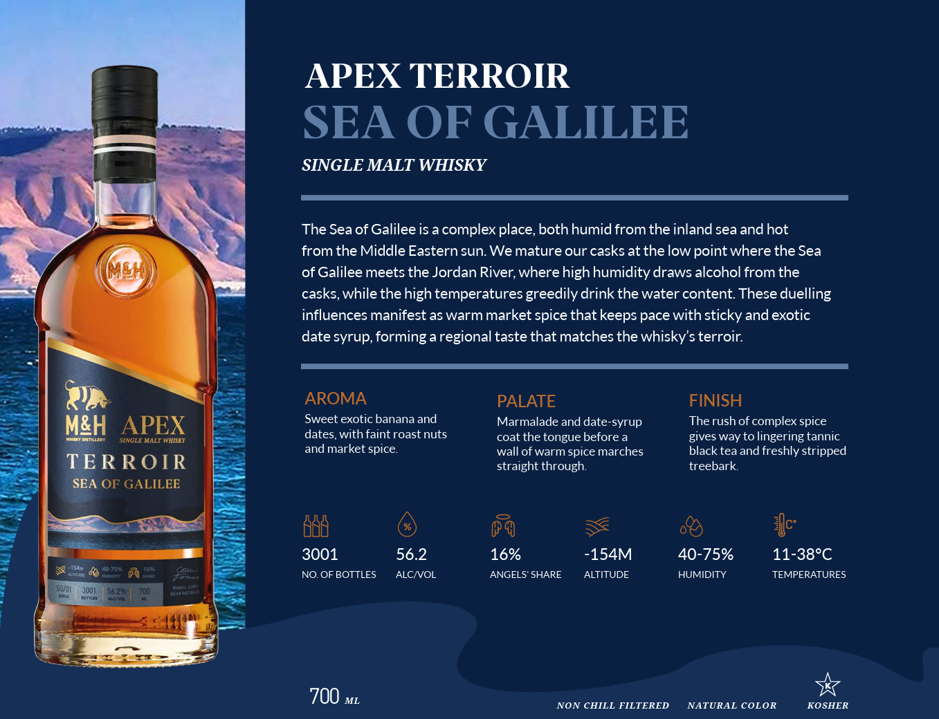 Galileiska sjön är en väldigt komplex plats, både fuktig från innanhavet och varm från Mellanösterns sol. M&H lagrar sina fat vid den låga punkten där Galileiska sjön möter Jordanfloden, där hög luftfuktighet drar ut alkohol från faten, medan de höga temperaturerna girigt dricker vatteninnehållet. Likt Dead Sea är denna plats extrem och kräver noggrann kontroll på faten under hela mognadstiden.