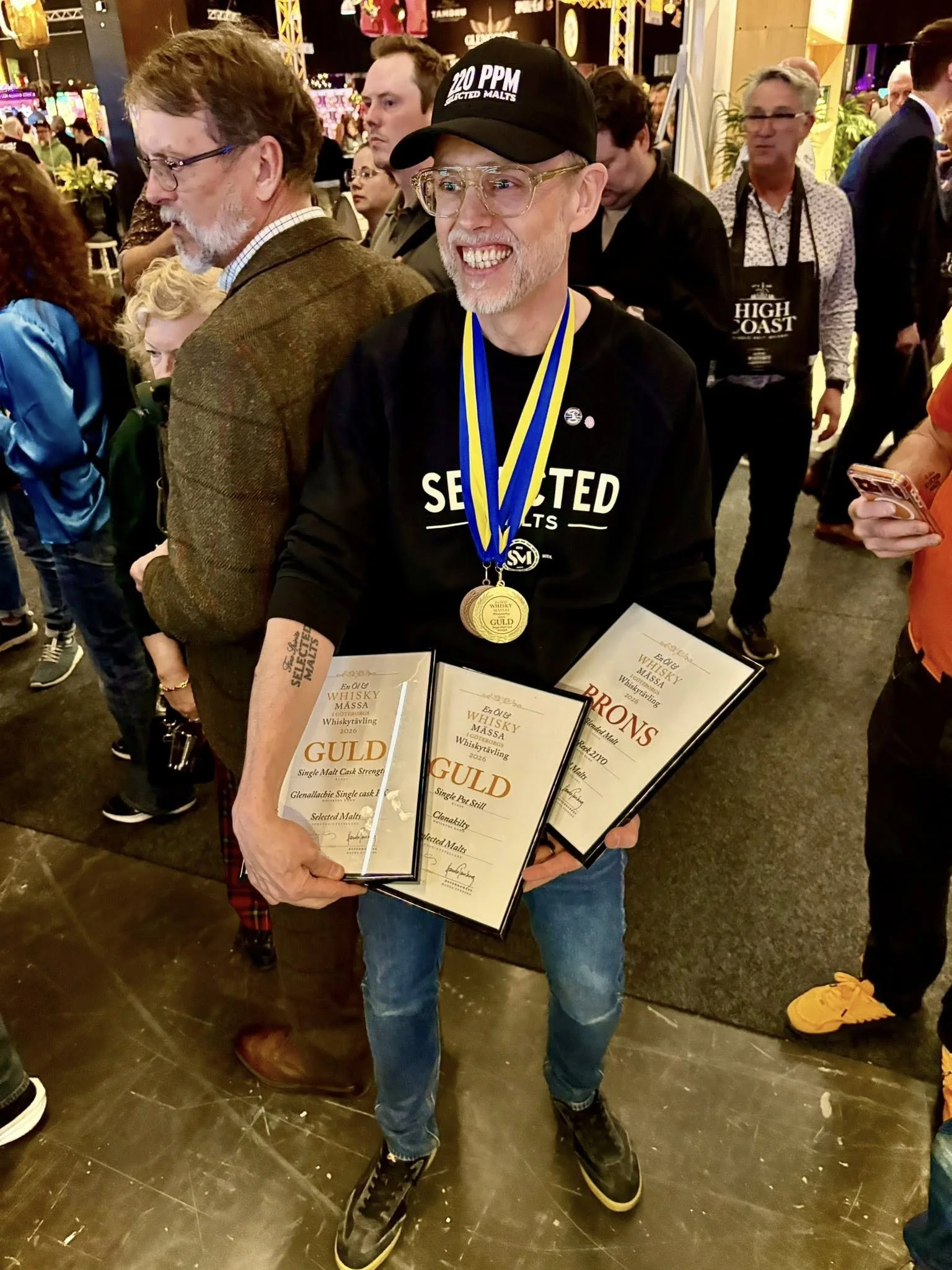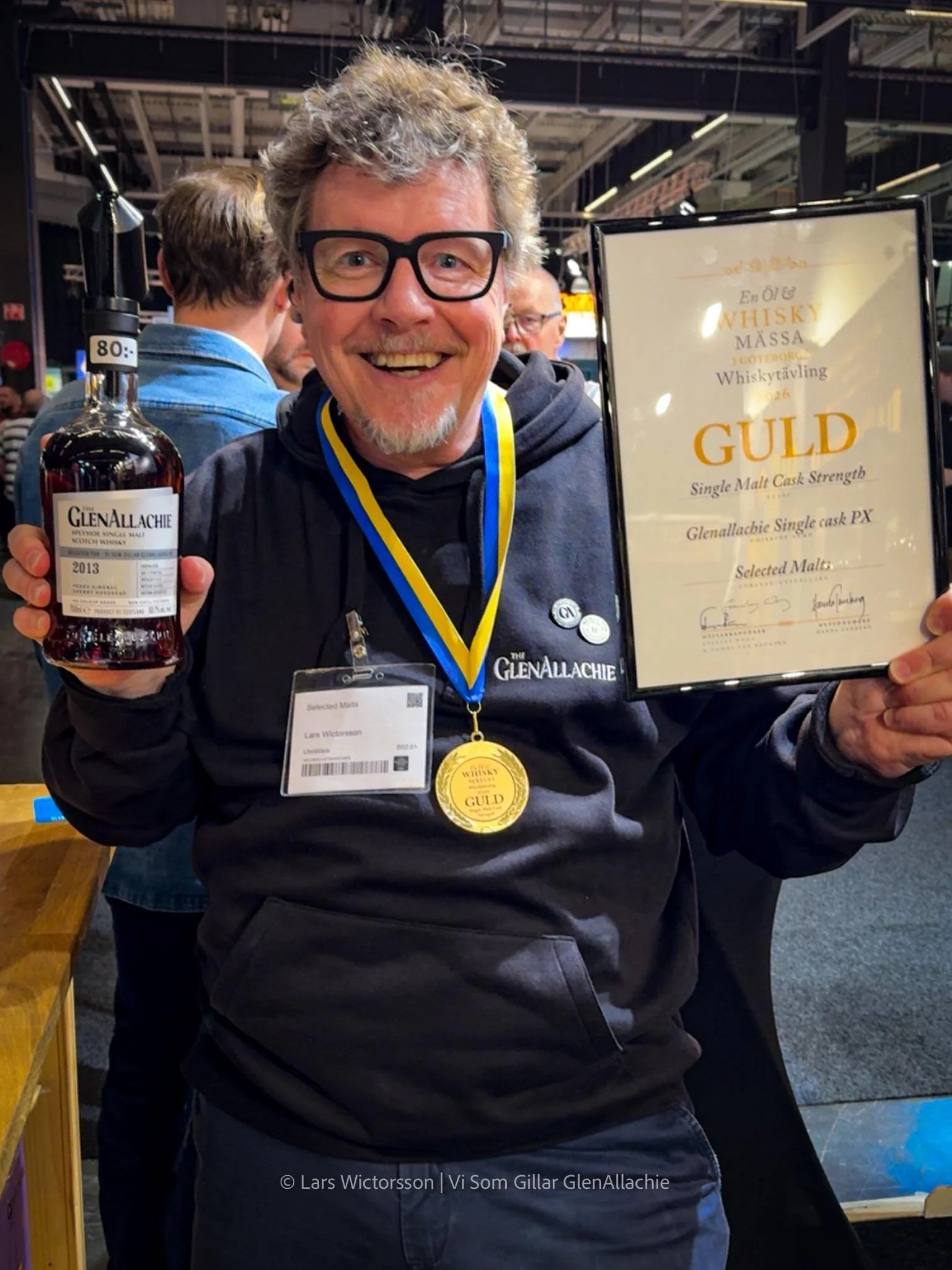 Den första Guldmedaljen fick den allra senaste i raden av single casks från Glenallachie. Lars Wictorsson som driver gruppen “Vi som gillar Glenallachie” som själv valt ut detta fatet speciellt för gruppen uttryckte enorm glädje och stolthet när han fick veta att den tagit guld i klassen cask strength whisky. För den som blir nyfiken på denna guldmedaljör så finns flaskor kvar och du hittar